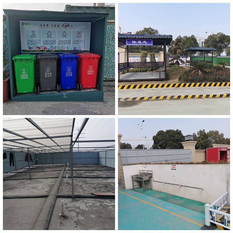除此之外,生活區還設置有垃圾分類專區,衣物晾曬區、鞋子晾曬區、專門的生活區抽煙亭等。同時設置講評臺,用于班組的日常活動,每日晨會,給班組反復增加安全教育,提醒安全事項。生活區的有序管理也是工地施工現場管理中的重要環節,舒適溫馨的環境有助于工地整體面貌的提升,令人心情愉悅的同時,可有效避免安全事故的發生,起到事半功倍的目的。