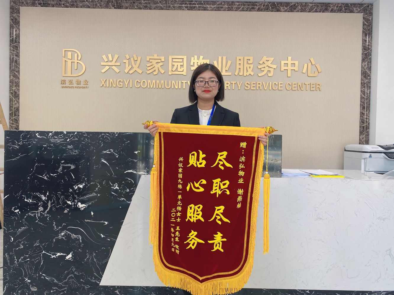 4月8日天氣很晴朗,但是業(yè)主楊女士的心情卻是很著急,她急急忙忙來(lái)到濱弘物業(yè)服務(wù)中心前臺(tái),告訴前臺(tái)工作人員她把鑰匙鎖在了門里,前臺(tái)工作人員謝燕楠立即聯(lián)系相關(guān)人員進(jìn)行解決。最后,在前臺(tái)人員熱情的幫助下很快便打開(kāi)了門,業(yè)主楊女士對(duì)前臺(tái)人員表示了真誠(chéng)的感謝,并在次日給前臺(tái)謝燕楠送了錦旗以示肯定。