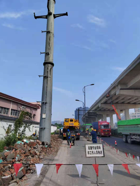 時代大道改建工程涉三江口取水口35KV許義線遷改項目是該工程建設推進過程中的重要節點。由于該重要節點推進時間緊、任務重且難度高,為確保工程的順利推進,該項目于2021年5月初開始實施,自開工以來,我司與設計單位、道路施工單位及中新電力施工方進行多次對接溝通,多次協同聞堰街道前往現場踏勘。通過數次現場實際摸底排查、幾方施工時序協調、強化現場人員做好安全圍護和安全警示標志等一系列舉措。中新電力工程建設有限公司派施工隊到三江口取水口處對35KV許義線12-25#鐵塔進行拆除。經過四個多月的努力,截止2021年8月20日,已完成土建、割接、收線、拆塔等工作,式完成遷改工作。