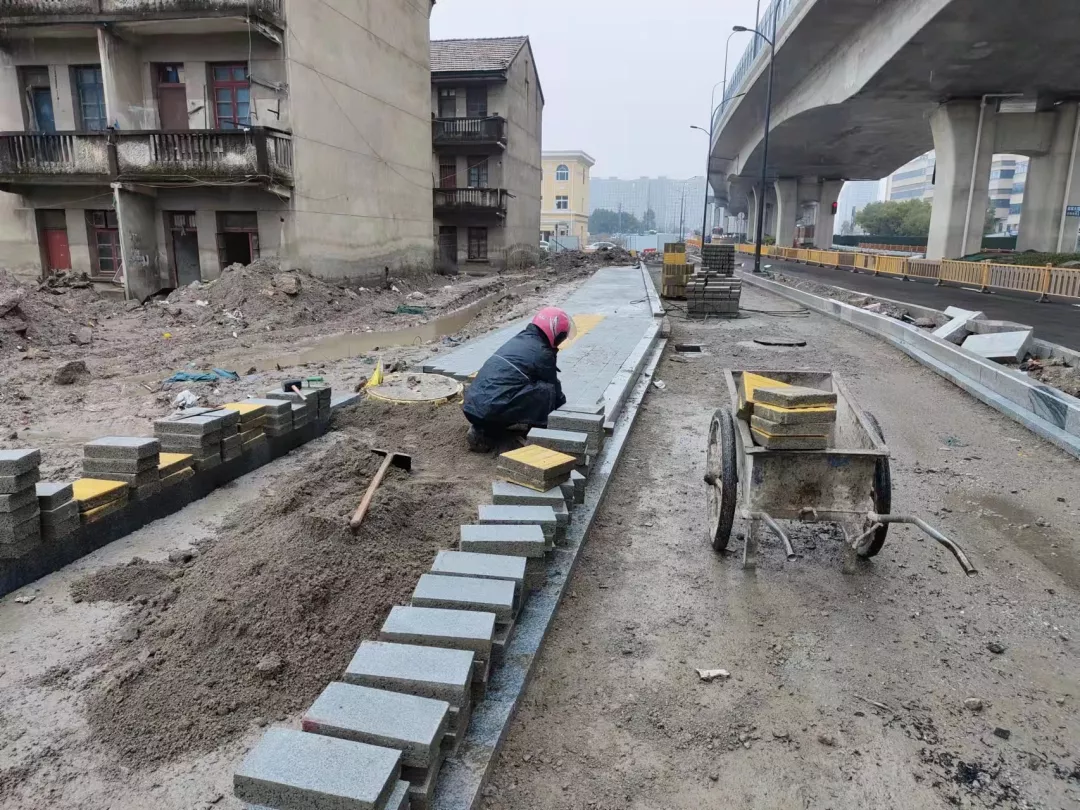 目前,本項目地面道路部分土建施工完成72%,其中,地面道路橋梁解放河橋進行瀝青攤鋪,北塘河橋開展橋面系施工;主車道路基、水穩(wěn)、瀝青攤鋪完成約95%;照明完成安裝72%,綠化中分帶完成53%。