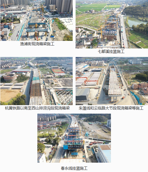 主體工程完成58%,高架橋下部結構完成84%、上部結構完成56%。其中:浦陽江以北高架橋下部結構完成88%、上部結構完成60%;浦陽江以南高架橋下部結構完成80%、上部結構完成42%。