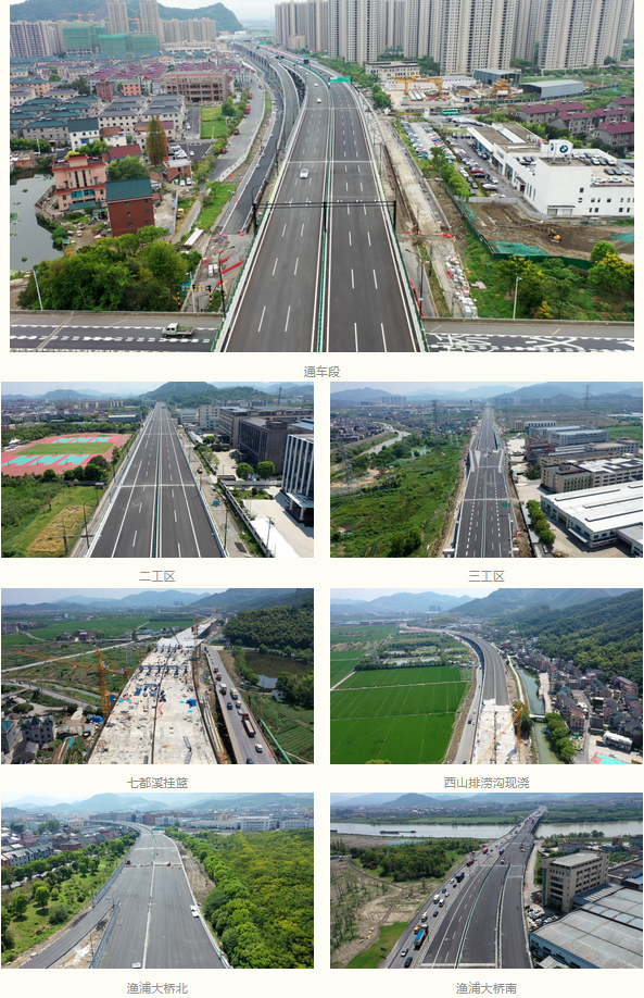 本項目起點接時代大道改建工程(繞城高速以南60米),沿線往南跨過浦陽江經過義橋鎮、戴村鎮,終點至與規劃城市中環線交叉以南1公里處,項目采用“高架+地面”道路形式,主線高架全長約11.2公里,地面道路全長約3.87公里。高架道路及地面道路均采用雙向六車道一級公路兼顧城市道路功能標準,設計速度為80公里/小時。