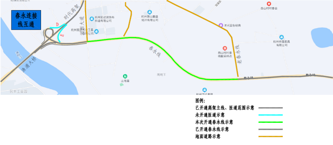 南向西(戴村往富陽(yáng)方向)可通過(guò)河西大道地面道路左轉(zhuǎn)進(jìn)入春永連接線向西通行。