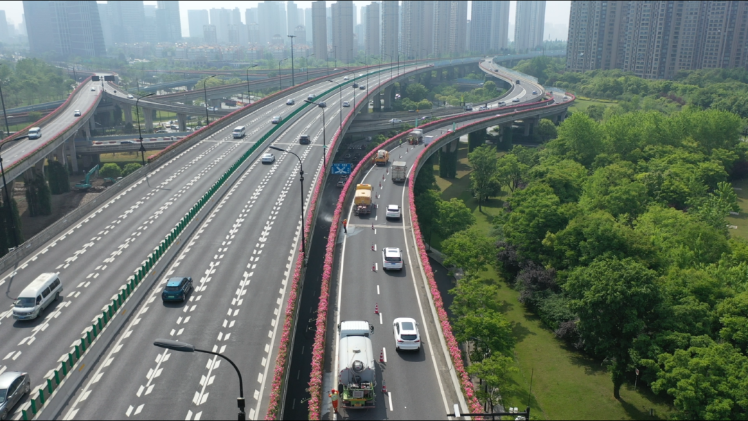 綠化美化提升工程采用的生態(tài)固化種植基質(zhì)及裝配式立體綠化工藝,克服了高架綠化中普遍存在的安全、揚塵污染、養(yǎng)護成本高等問題,采用不銹鋼鋼架結(jié)構(gòu)和壓力補償式自動滴灌系統(tǒng),規(guī)格統(tǒng)一,裝配便利,經(jīng)久耐用,節(jié)水明顯,實現(xiàn)高架立體綠化景觀效果和管養(yǎng)的最優(yōu)化。