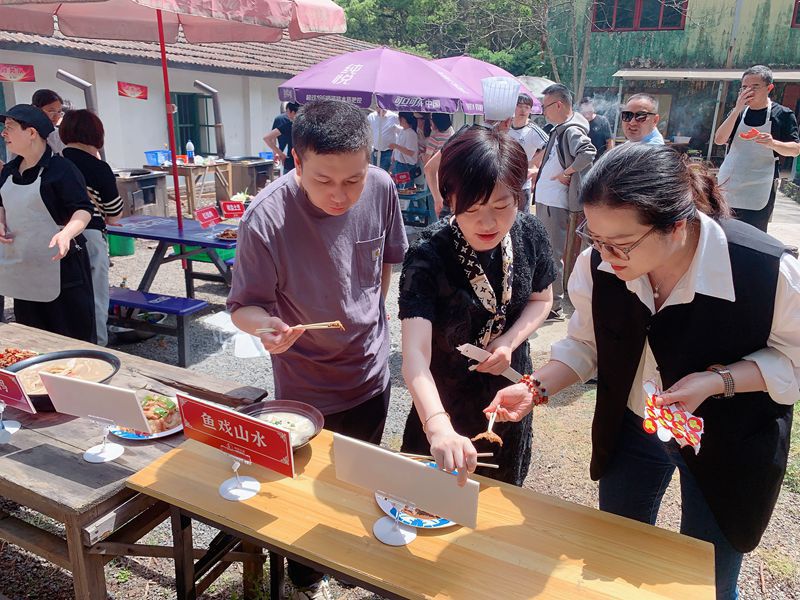 參賽隊伍分工明確、配合默契、“各顯神通”,有專門負責掌勺的、燒柴火的、切菜備菜的、準備調料的、清洗廚具的,活動現場,大家忙得不亦樂乎。經過一番親密無間的努力,帶著濃濃煙火氣的美食作品一道道呈現,看起來秀色可餐,每道菜的擺盤也可以看出大家的用心。