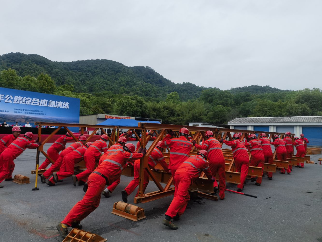 演練首先模擬了鋼橋受損的緊急情況。面對(duì)突如其來的險(xiǎn)情,各參演隊(duì)伍迅速集結(jié)、密切配合,采取現(xiàn)場(chǎng)架設(shè)一座跨徑15米的321型裝配式公路鋼橋的方式,開展突發(fā)事件應(yīng)急處置。“立桁架、豎支撐、架橫梁、鋪設(shè)面板、推橋、落橋”搶險(xiǎn)過程分工明確、技術(shù)嫻熟、配合默契,在短時(shí)間內(nèi)完成了鋼橋的臨時(shí)搭建工作,確保了交通的暢通無阻。