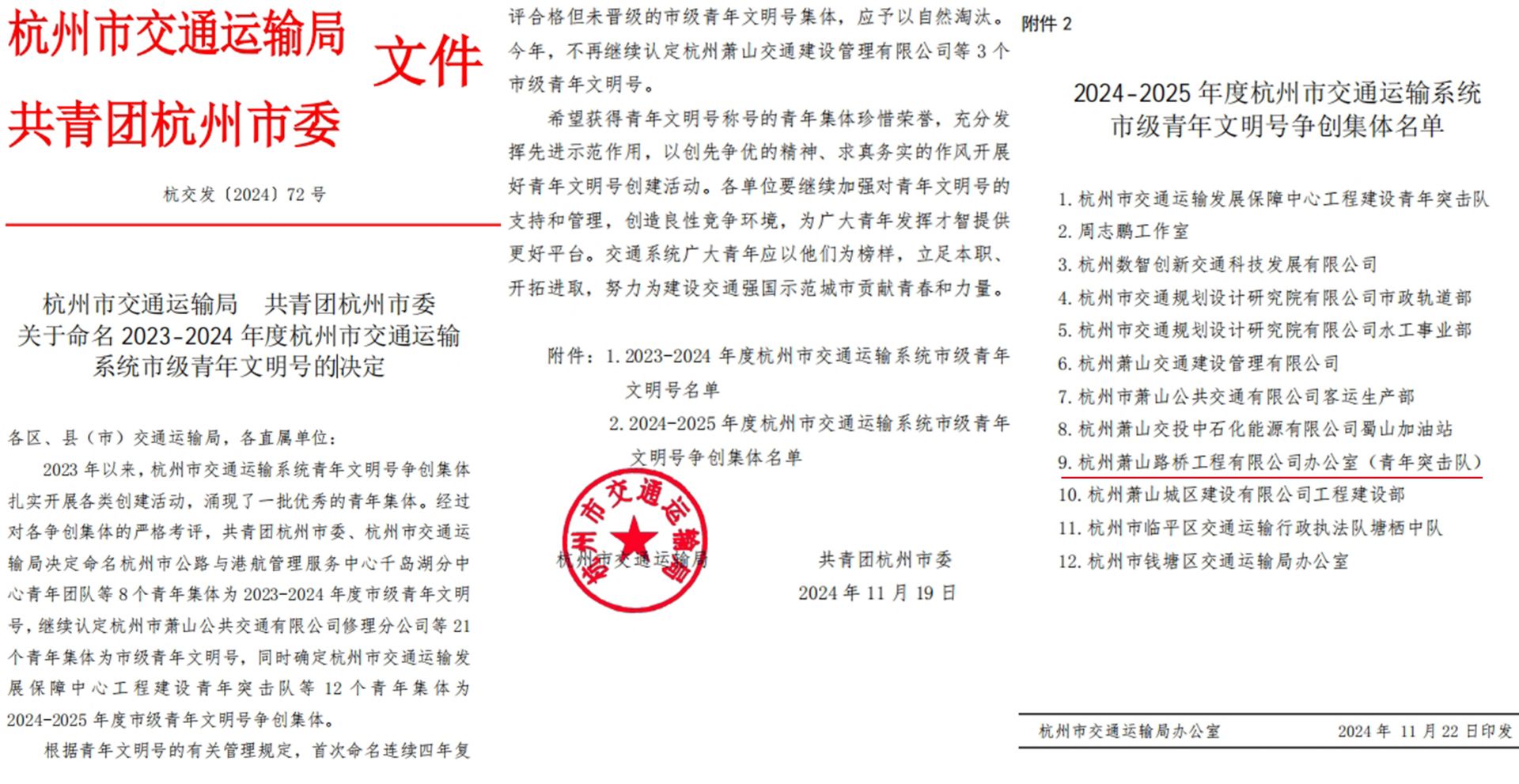 2.青年文明號集體爭創的“奮斗者”。2023年以來,杭州市交通運輸系統青年文明號爭創集體扎實開展各類創建活動,涌現了一批優秀的青年集體。經過對各爭創集體的嚴格考評,路橋青年突擊隊獲得2024-2025年度杭州市交通運輸系統市級青年文明號爭創集體。接下來,青年突擊隊將與青年文明號等“青”字號品牌活動融合互促,總結經驗做法,擦亮“青”字品牌,爭取在2025年榮獲市青年文明號榮譽,為公司高質量發展貢獻力量。