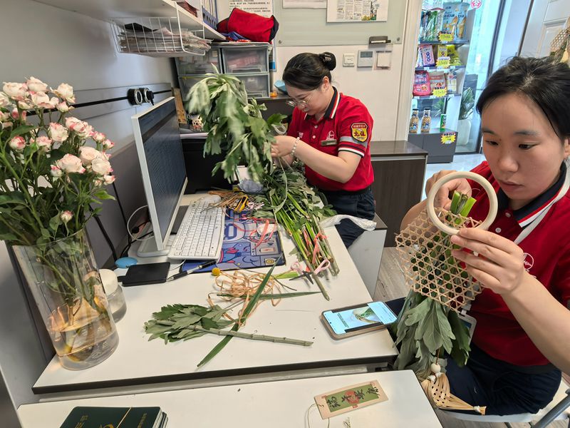 公司組織員工親手制作了各類艾草手工藝品,編竹網、綁艾草,成了端午節最應景的裝飾。員工將親手制作的手工品贈送給到站顧客,向他們表示感謝,謝謝他們的光顧和對站點的支持,并為他們送上端午祝福。