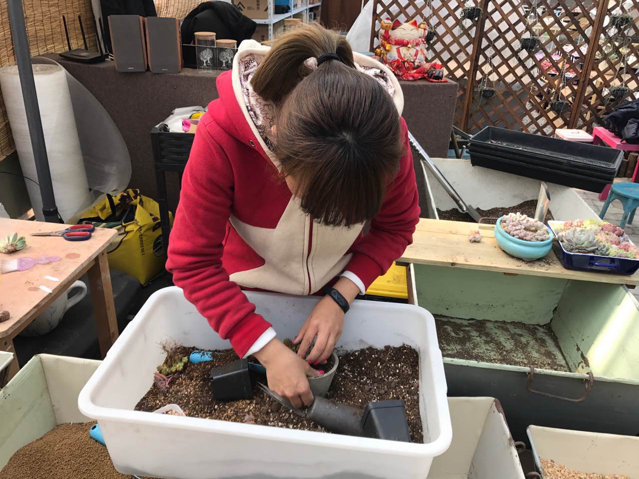 多肉植物園老師現(xiàn)場(chǎng)為女職工拼裝多肉植物。