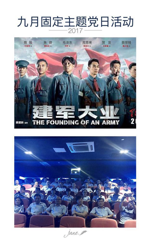 為慶祝中國人民解放軍建軍90周年,以良好的風貌迎接黨的“十九”大召開,結合9月份的“固定主題黨日”活動,9月8日下午,長運公司組織全體黨員(預備黨員)、入黨積極分子共同來到蕭山時代鳳凰國際影城觀看了電影《建軍大業》。