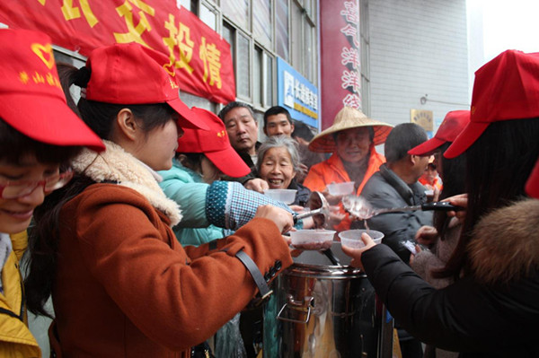 “我很多年沒有吃過臘八粥,謝謝這些小年輕。”汽車總站的環(huán)衛(wèi)工人吃著熱騰騰的粥開心地合不上嘴。
