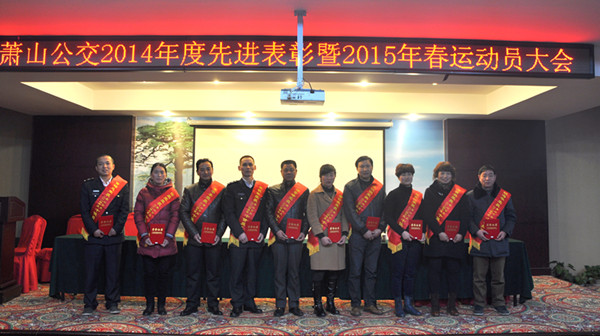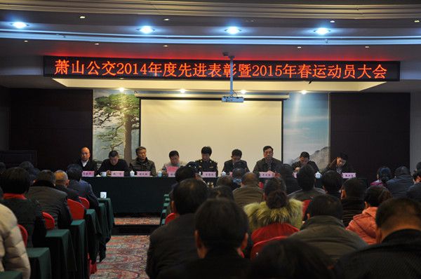 1月28日,公司召開專題會議,表彰2014年度各類先進,部署動員2015年春運工作。區交通運輸局步蘇琴副局長、蕭山交投集團王齊天副總經理等上級領導應邀出席會議。公司全體班子成員,全體中層干部,各類先進及職工、班組長代表共180余人參加了會議。