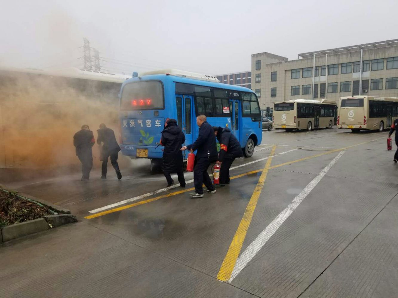 9時40分,場區啟動停車場消防應急預案。9時41分,場站保安人員發現臨浦中心站東南區塊濃煙滾滾,迅速拉響警鈴,同時通知在場人員火警情況;9時42分,車隊人員、物業人員、修理廠人員以及保安人員迅速趕至起火點開展滅火自救并由車隊長進行現場指揮,9時46分,消防水帶出水,9時47分“火勢”撲滅,警報解除。演習取得預期效果。
