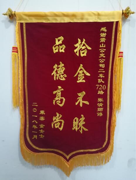 1月14日下午,公交公司西站站房進來一對夫妻連聲道謝,并送上一面印著“品德高尚,拾金不昧”的錦旗。原來在12日,720路司機張清在一圈一檢中發(fā)現(xiàn)有個黑色雙肩包,張師傅連忙把包拿到站房,交給站員錢林茂。站員打開包檢查,發(fā)現(xiàn)大量現(xiàn)金和證件在里面,一數(shù)竟有7000元人民幣。站員通過包里一張名片上的號碼成功聯(lián)系上失主的老公。半小時后,失主夫妻拿著證件前來認領(lǐng)。兩天后就出現(xiàn)了開頭的一幕。雖然這看似一件小事,但就是通過這件小事,體現(xiàn)出我們蕭山公交人的精神風(fēng)貌和高尚品德,讓我們?yōu)閺埱鍘煾岛凸蝗它c贊!