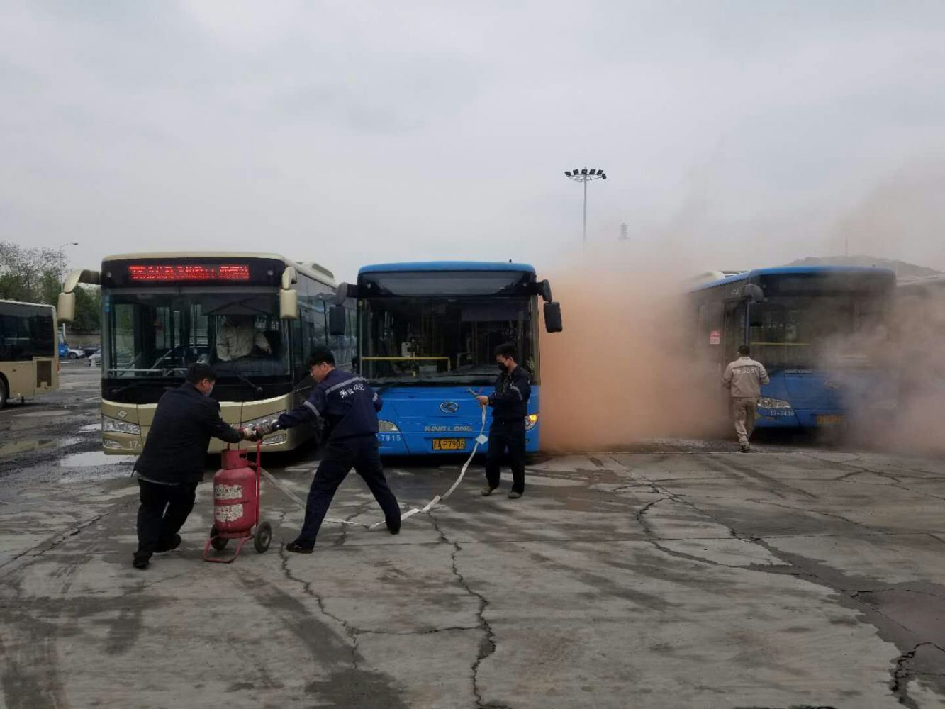 9時(shí)45分啟動(dòng)停車(chē)場(chǎng)消防應(yīng)急預(yù)案,公司領(lǐng)導(dǎo)進(jìn)行現(xiàn)場(chǎng)觀摩、指導(dǎo)。9時(shí)46分,保安人員發(fā)現(xiàn)“火情”,迅速吹響口哨,9時(shí)47分,修理分公司人員、自行車(chē)分公司人員迅速趕至起火點(diǎn)并在修理分公司管理人員指揮下進(jìn)行撲救,9時(shí)49分,修理廠施救車(chē)司機(jī)將周邊車(chē)輛進(jìn)行疏散,9時(shí)50分“火勢(shì)”撲滅,警報(bào)解除。