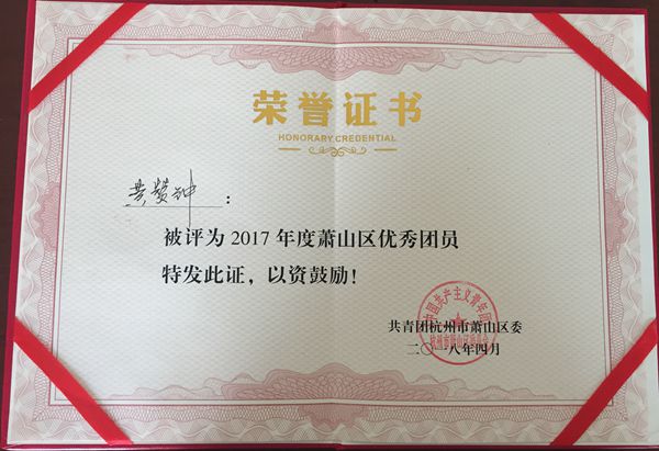 近日,長運修理分公司黃贊鐘同志榮獲共青團杭州市蕭山區(qū)委授予的“2017年度蕭山區(qū)優(yōu)秀團員”稱號。