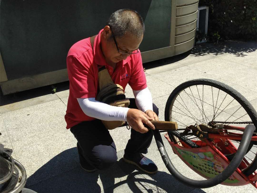 公共自行車值守人員李國平,每天在體育館南服務點頂著烈日高溫,檢查、擺放站點車輛。僅在早晚高峰時段,上樁下樁車輛就達兩百多車次。衣服被汗水浸濕了又干,干了又濕。調度車駕駛員陳炳田和搬運工來可奇、王國榮,每天運送公共自行車兩百多輛。自行車站點上熱浪襲人,剛剛裝、卸幾輛自行車的他就已大汗淋漓,臉上掛滿汗珠。汗水流進了眼睛,汗水沁透了衣衫。才稍微干了點兒的衣服立即又濕了一大片。自行車維修工董浩成,每天拿到任務單后,便開始了一天的檢修工作,為自行車挨個“體檢”,每天工作近10小時,從早上上班開始,雙手就因為修車沾滿了油污和泥土,他們嫻熟的動作、十足的干勁、揮灑的汗水……不由地令人心生敬意。