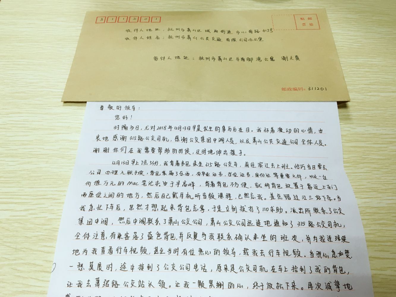 12月19日,蕭山公交班子領(lǐng)導(dǎo)收到一封來自市民的感謝信,字里行間深切表達(dá)了其對315路公交司機(jī)、公交公司以及公交集團(tuán)中調(diào)人員的感謝。經(jīng)了解,信中提到的公交司機(jī)為四車隊(duì)張冠軍。原來,12月13日中午,謝女士再乘車前往濱江的過程中,由于正逢早高峰,在下車時(shí)不慎將背包遺落在座位上。后經(jīng)過派出所、集團(tuán)中調(diào)與蕭山公交的多方聯(lián)系,順利前往站房尋找失物。而另一邊張師傅在到站巡查時(shí),也發(fā)現(xiàn)了車內(nèi)的背包,于是立即前往站房上交車隊(duì),此時(shí)謝女士在蕭山公交管理人員的陪同下已經(jīng)在站房等候了,經(jīng)仔細(xì)核對后,張師傅將失物歸還原主。