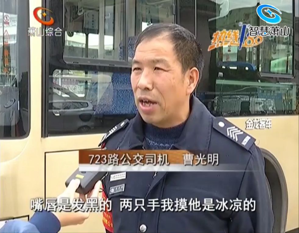 事情發生在12月19日,上午9:25分左右,蕭山公交一車隊司機曹光明駕駛723路從江橋北公交站開往廣仁小區,途徑潘水站時,從后視鏡內觀察到車上一位老人臉色蒼白,頭部靠著車窗,情況異常,曹師傅立刻將車輛安全???,上前查看情況。
