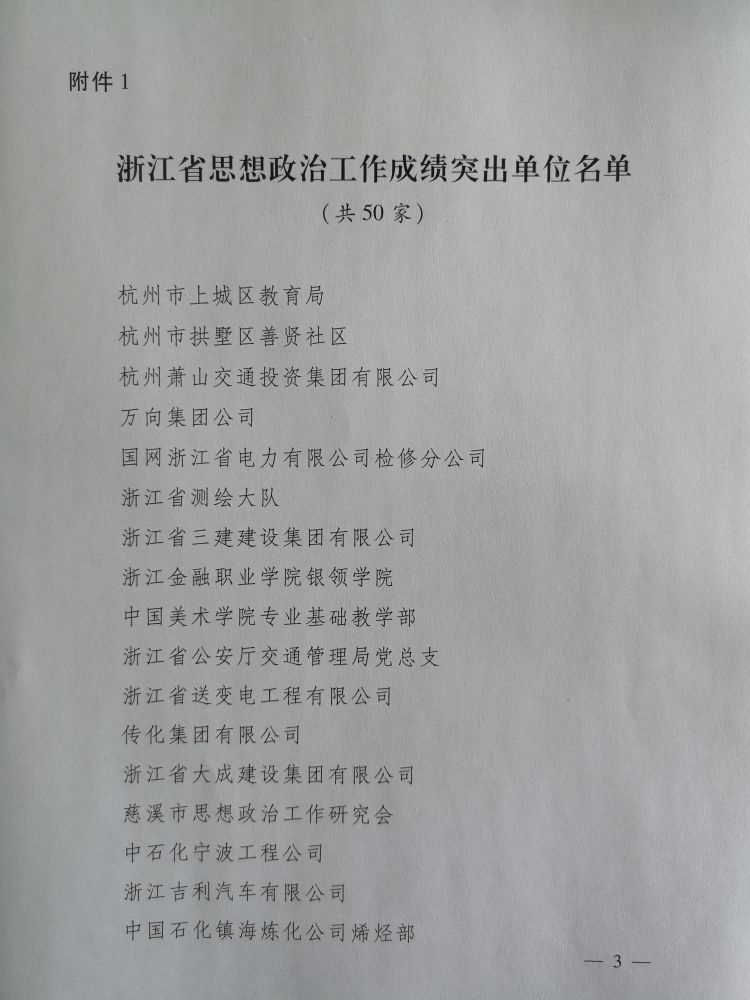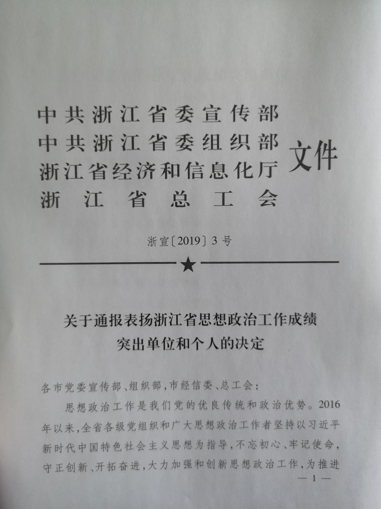 經最終評定,榮獲“浙江省思想政治工作成績突出單位”。