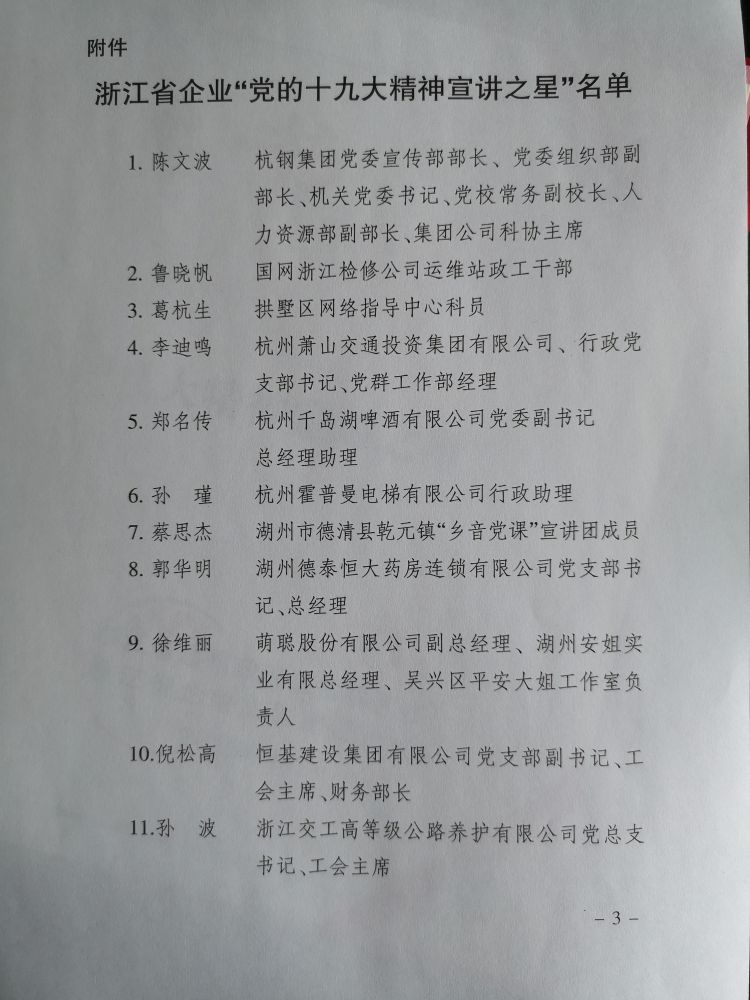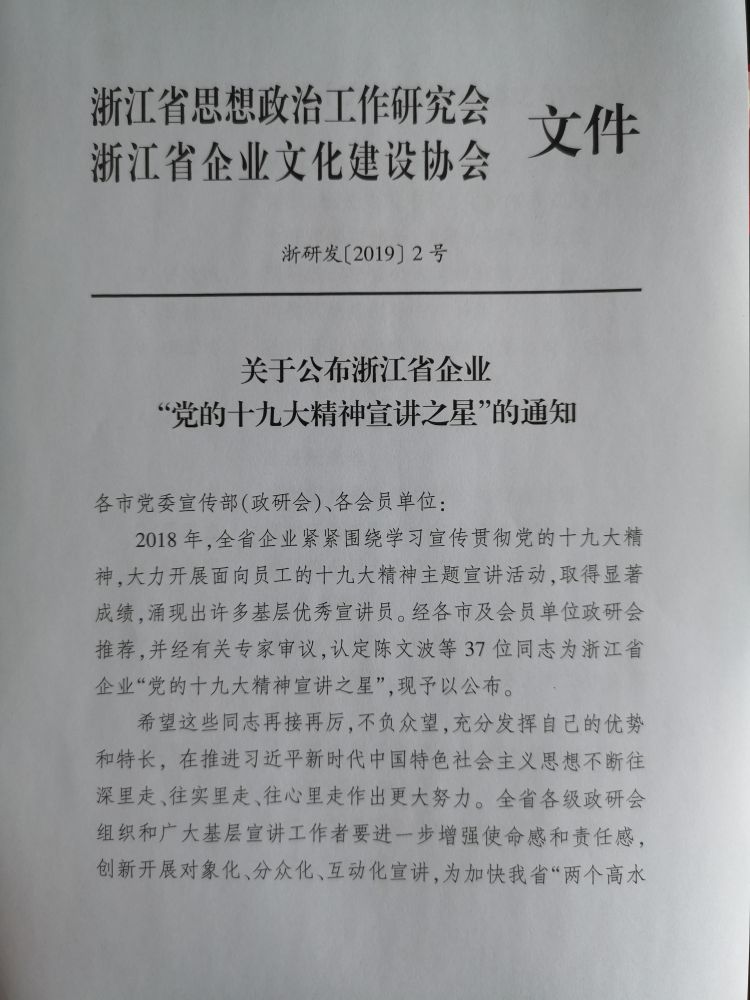 此外,集團行政黨支部書記、黨群工作部經理李迪鳴榮獲浙江省企業“黨的十九大精神宣講之星”稱號,全省共37位同志獲此殊榮。